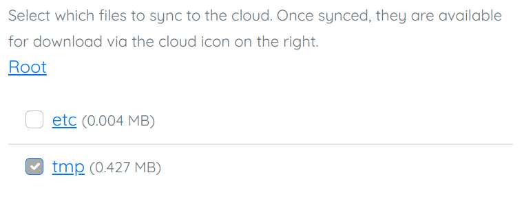 Dropbox for robots. Solves the problem of sharing files from the robot by synchronizing them to the cloud and making them accessible from there. Using this capability, an admin specifies sets of files on a device that users can see and request to be synchronized to the cloud from where they can be downloaded. For instance, an admin might share the file-set described by /var/data/image/*/*.jpg. The device would then watch the matching file listings on disk and synchronize that file listing to the cloud. In a second UI, intended for use by non-privileged users, a user can select which of the files in that set are of interest and should be synchronized with the cloud.