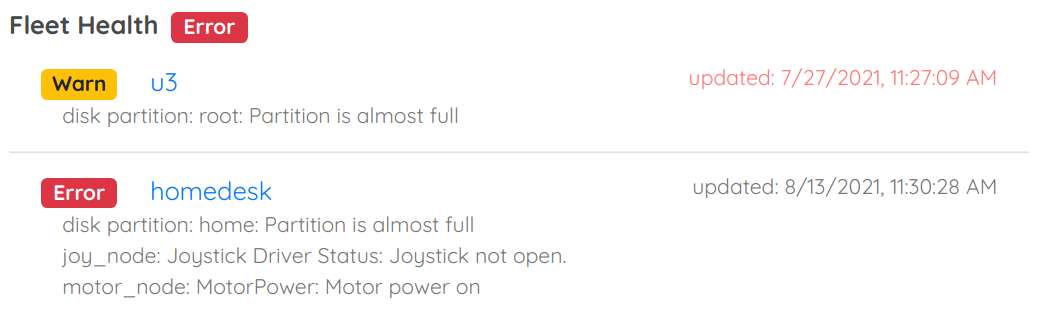 Aggregates diagnostics data from devices, synchronizes them with the cloud, and aggregates them for easy monitoring. On the robot the capability collects diagnostics from the ROS /diagnostics topic as well as some hard-coded OS level metrics (CPU temperature, GPU temperature (NVIDIA only), and available disk space).