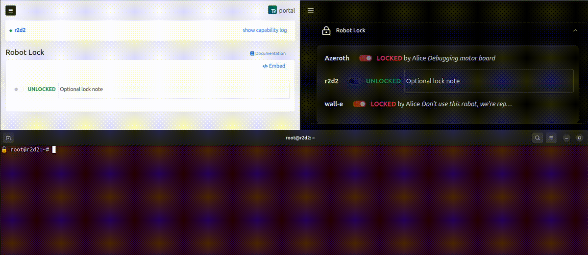 In addition to showing the lock status in the UI component, which you can embed in your own dashboards wherever you want, it also lets you add the current lock status to the PS1 (shell prompt) on the robot. To set this up just add the following to your .bashrc (or similar for other shells):