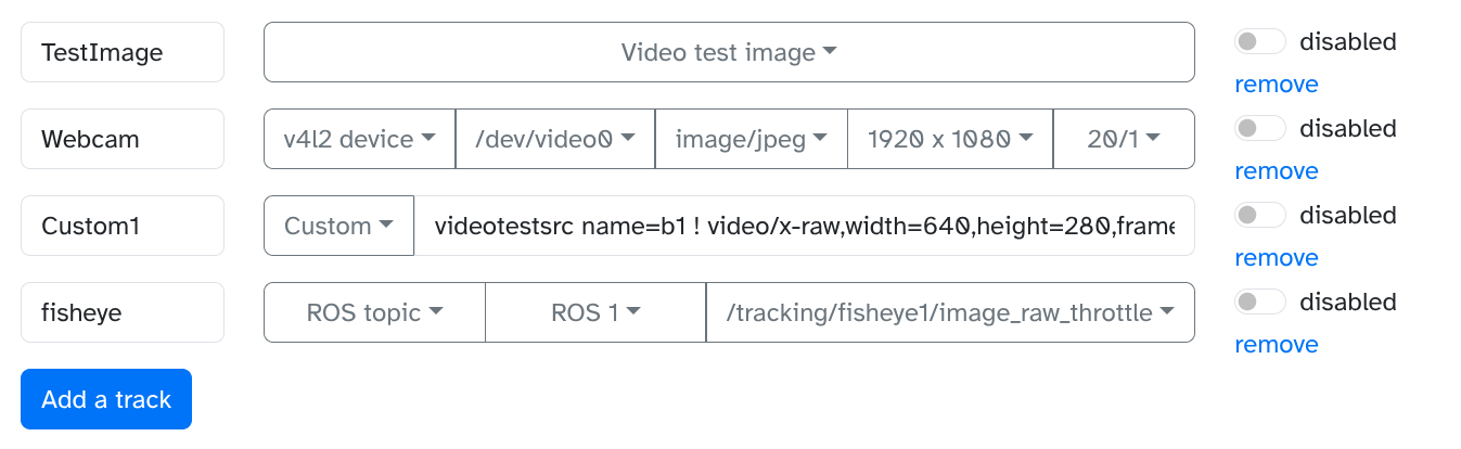 Supports the same video sources as WebRTC Video, incl. v4l cameras, rtsp streams, ROS topics, as well as arbitrary custom gstreamer source pielines.